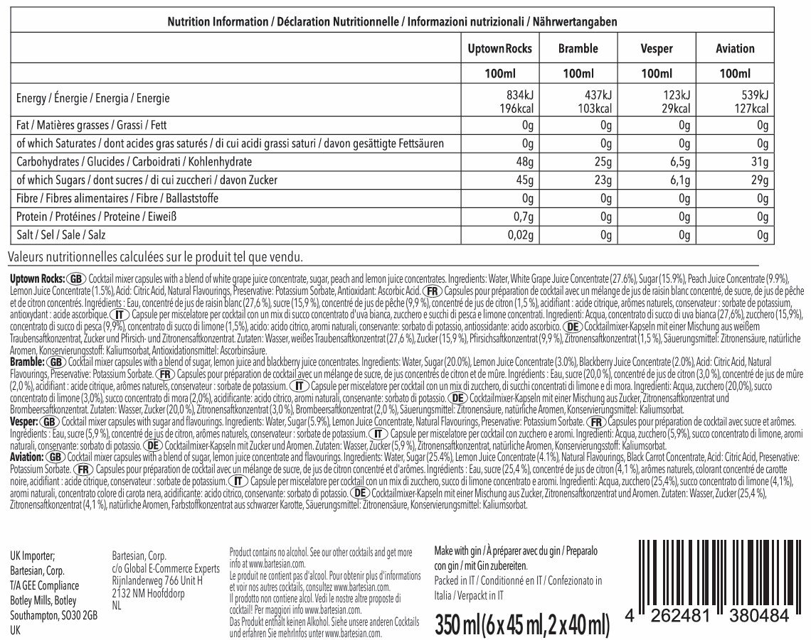 Four of Bartesian’s most-loved gin cocktails, crafted by expert mixologists for exceptional taste. Each capsule is made with real juices, extracts, bitters and no artificial colours or ingredients. This variety pack contains 2 each of 4 cocktails: