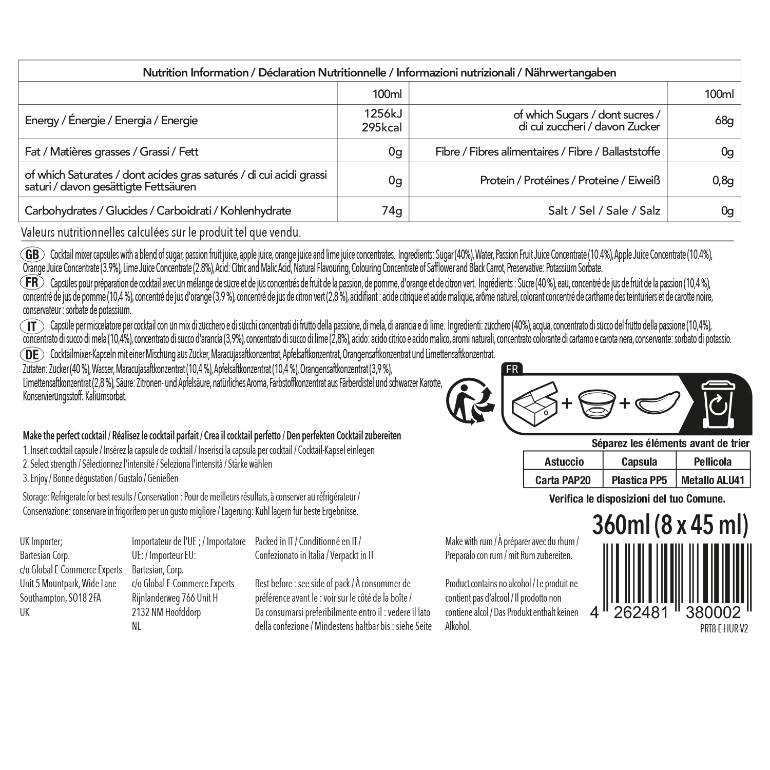 Alcohol Volume: Mocktail = 0 oz., Light = 1.4 oz., Regular = 2.0 oz., Strong = 3.4 oz.