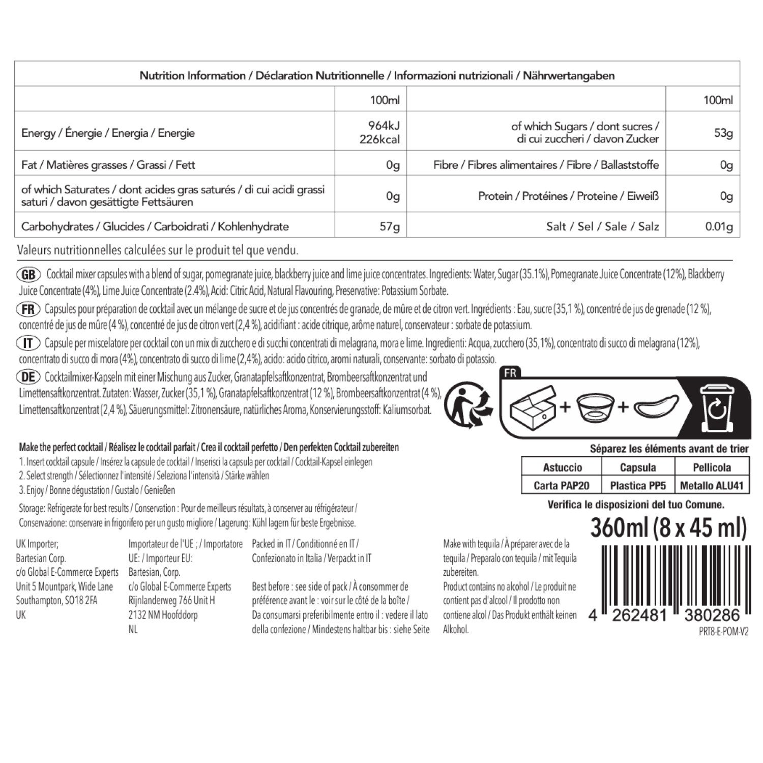 Alcohol Volume: Mocktail = 0 oz., Light = 1 oz., Regular = 1.5 oz., Strong = 2.5 oz.